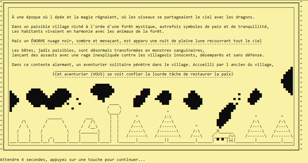 Il s'agit d'un projet de développement d'un jeu vidéo en 2D par un studio indépendant, utilisant la console CMD. Le jeu se déroulera au Moyen Âge dans un univers fantastique peuplé de dragons et de magie. Vous devrez gérer les statistiques de votre personnage ainsi que ses ressources, et le faire évoluer grâce à des points de compétence.